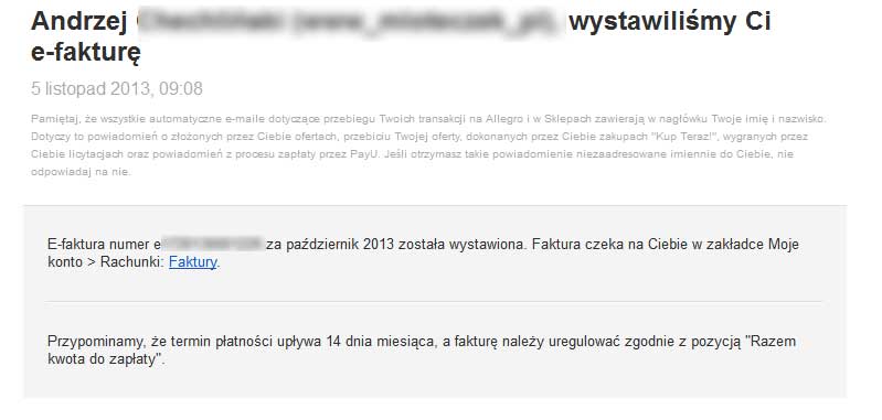 Druga sprawa – same faktury. Allegro zrobiło wielką kampanię informacyjną, że dbając o ekologię przechodzą na e-faktury. Wszystko fajnie, tylko dlaczego email informujący mnie o nowej fakturze nie ma w załączniku pliku pdf z fakturą_ Pryecie to banalnie proste! W wersji Allegro musy się zalogować do konta w Allegro i przeklinać się przez gąszcz zakładek. Można również kliknąć w podlinkowane słowo „Faktury” co ma przenieść do odpowiedniej zakładki – rozwiązanie połowiczne, sprawdzi się dla firm posiadających tylko jedno konto w Allegro, ale o tym dalej.Tak wielki gracz na rynku eCommerce jakim jest Allegro powinien pisać książki z usability stron, ale patrząc na ostatnie zmiany w layout wiemy, że mają z tym spory problem.