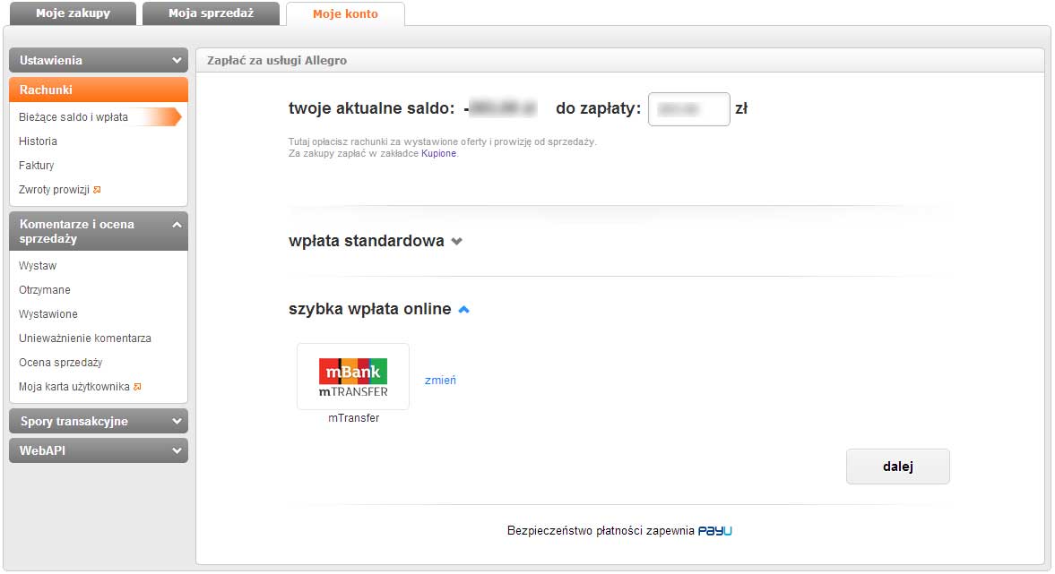 Pierwsza sprawa. Zacznijmy od tego jaką kwotę powinniśmy zapłacić za ostatni miesiąc? Allegro podsuwa nam kwotę całego zadłużenia, a nie tylko za ostatnią fakturę a co za tym idzie zapewne sporo osób nie zauważając tego sprytnego posunięcia wpłaca na ich konto sporo większa kwotą zamiast tej z ostatniej faktury. Niesie to za sobą spore kłopoty w rozliczeniach bo faktura powiedzmy jest na 1000 zł a przelew za tą fakturę za 1500 zł – i weź to teraz wytłumacz księgowej albo Skarbówce jak jesteś na pełnej księgowości. Chcąc wpłacić właściwą kwotę z faktury i nie przepłacać najpierw musimy znaleźć zakładkę z kwotami faktur, potem przeklikać się do miejsca gdzie definiuje się płatności i ręcznie wpisać kwotę faktury.